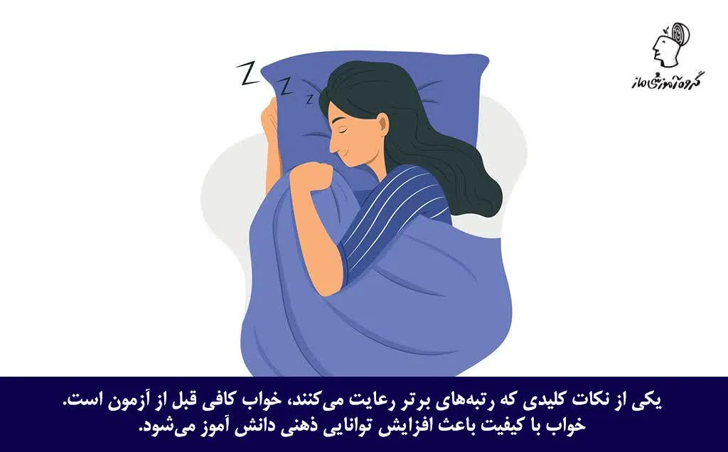 بدن خسته و ذهن ناآرام، بزرگ‌ترین دشمن تمرکز در آزمون است. شب قبل از آزمون تا حد امکان زود بخوابید. از مصرف زیاد قهوه و نوشیدنی‌های انرژی‌زا پرهیز کنید و شب قبل از آزمون، مطالعه را زودتر تمام کنید تا خواب کافی داشته باشید.